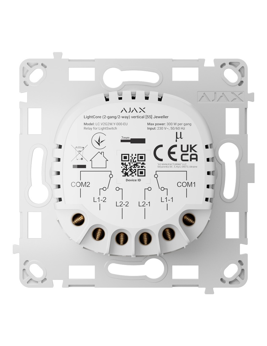 Relé interruptor inteligente doble y conmutable - Inalámbrico 868 MHz Jeweller - Alcance de comunicación hasta 1100 m - Alimentación 230 V AC 50 Hz - Sin necesidad de cable neutro - Ajax - LightSwitch LightCore Vertical (2G / 2W)