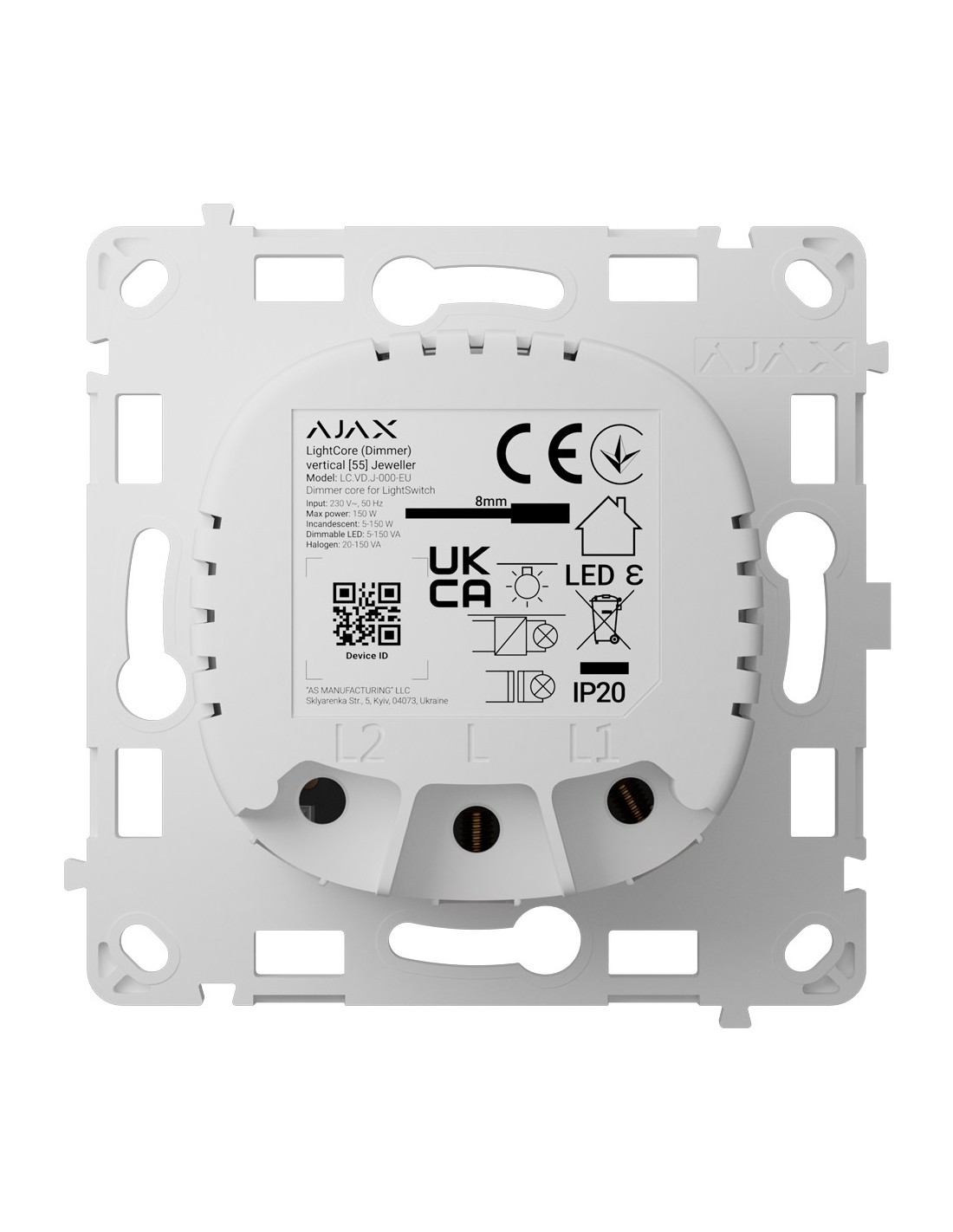 Relé interruptor de luz inteligente regulable - Inalámbrico 868 MHz Jeweller - Alcance de comunicación hasta 900 m - Alimentación 230 V AC 50 Hz - Sin necesidad de cable neutro - Ajax - LightSwitch LightCore (Dimmer) Vertical