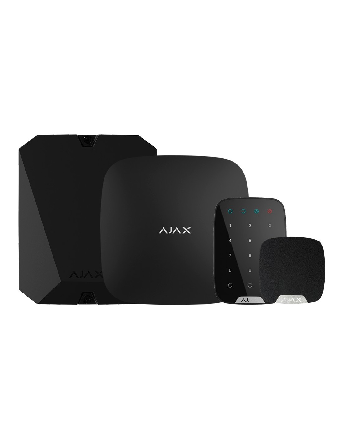 El kit incluye el panel de control AJ-HUB-B, un módulo de integración AJ-MULTITRANSMITTER-3EOL-B, un teclado inalámbrico AJ-KEYPAD-B y una sirena interior AJ-HOMESIREN-B.