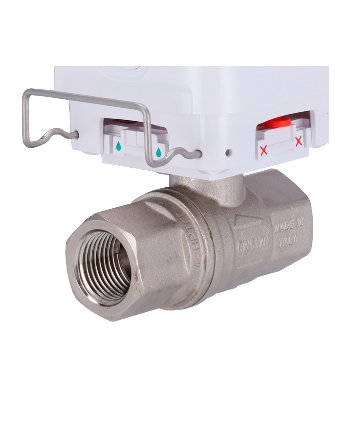 Electroválvula de cierre de agua - Válvula Bonomi de 1/2" (DN 15) - Compatible con tuberías de agua caliente y fría - Cierre de la válvula en menos de 5 segundos - Admite escenarios de automatización - Alimentación 4 baterías CR123A o a 7,5~14 VDC