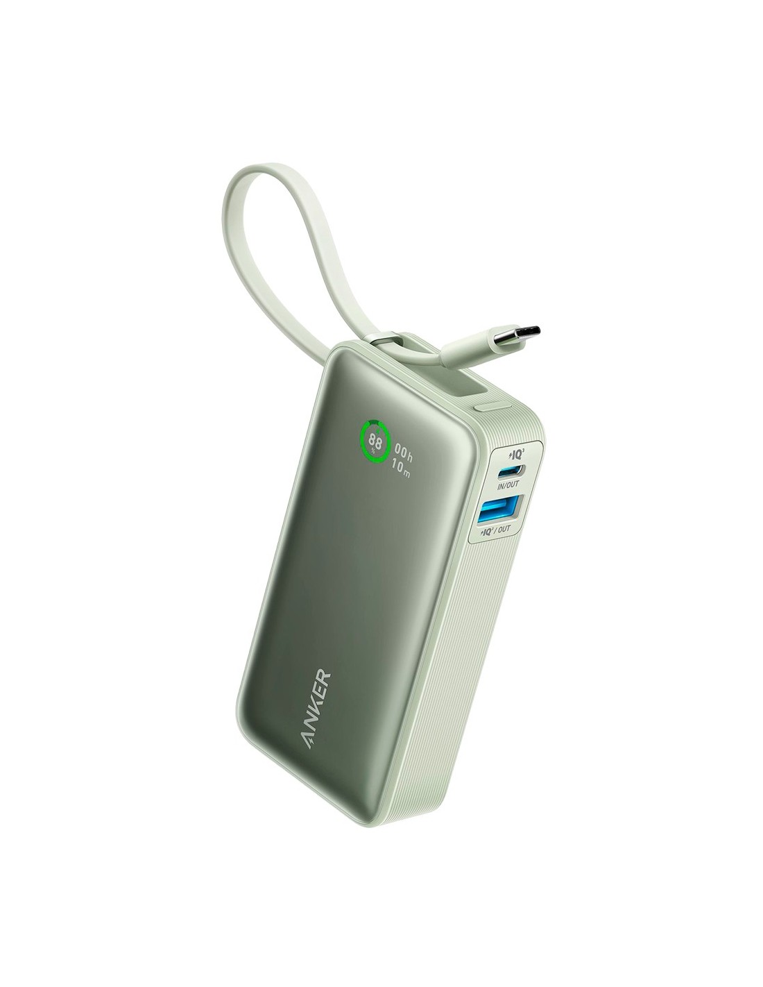 Anker Power Bank con pantalla LCD - Capacidad 10000mAh | Color verde - Entradas cable integrado, Puerto USB-C - Salidas cable integrado, USB-C y USB-A - Cable integrado: USB-C - Carga rápida | 3 dispositivos a la vez