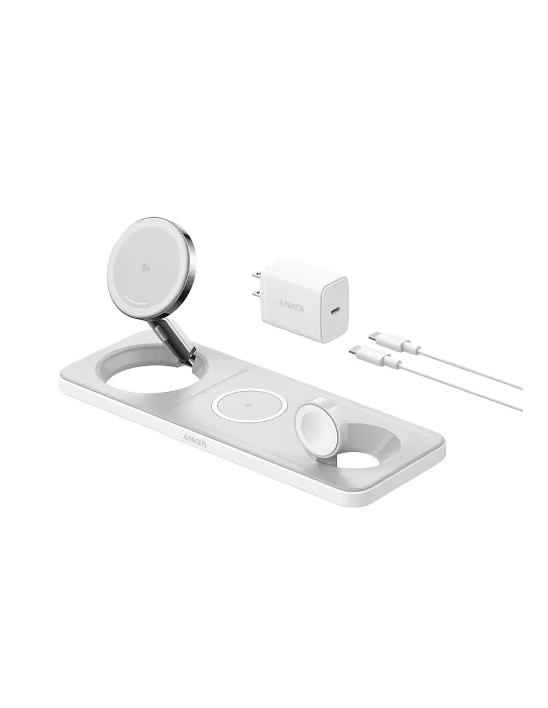 Cargador inalámbrico 3 en 1 Anker - Tecnología MagGo - Carga rápida: iPhone, Airpods, Apple Watch - Carga 3 dispositivos a la vez - Carga rápida 25W - Estructura plana | Color blanco