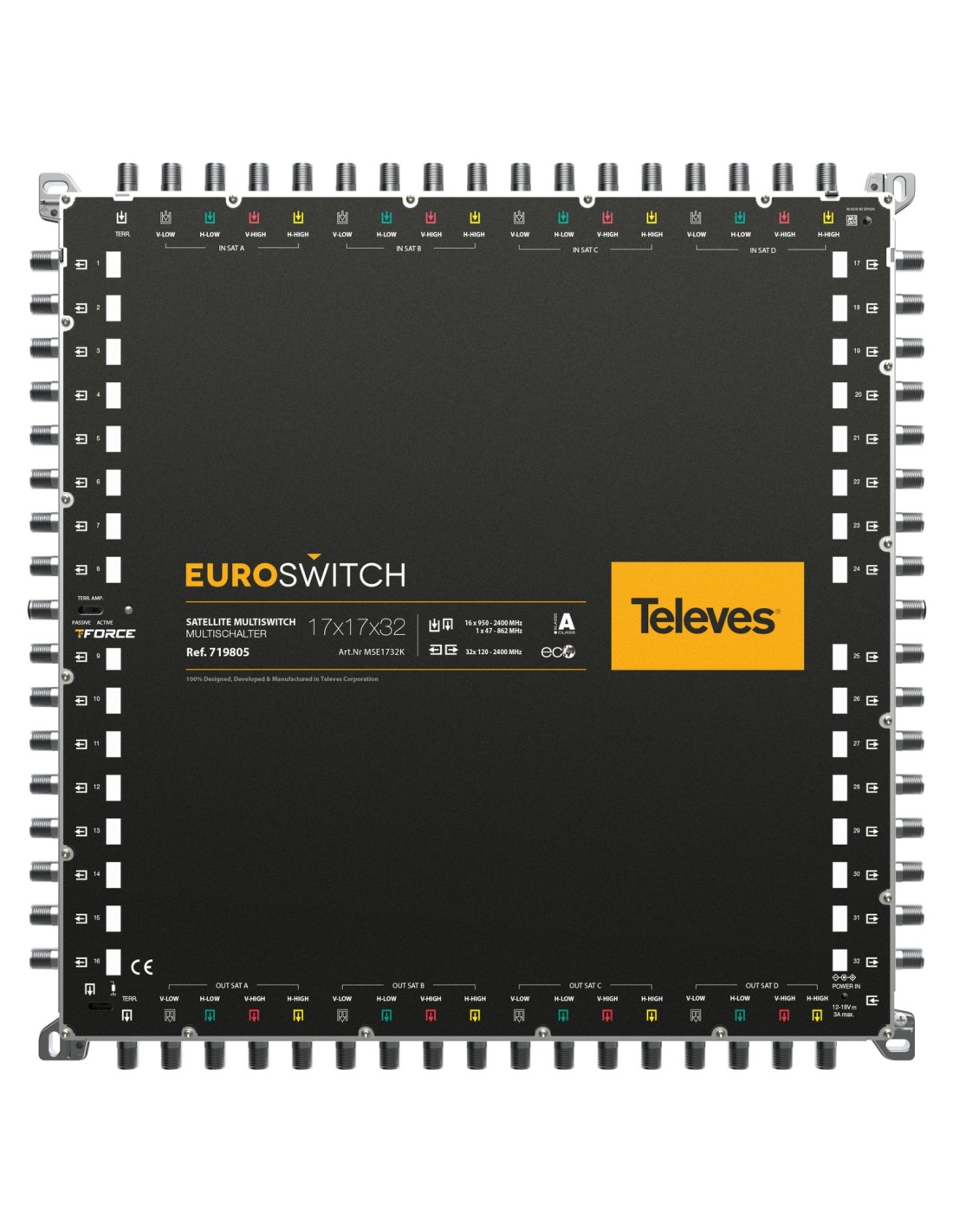 EuroSwitch 17 entradas - 32 salidas . Multiswitch compacto de 17 entradas (una terrestre y 16 para cuatro satélites, todos con sus cuatro polaridades) y 32 salidas de usuario.Gracias a su gran compacidad y su diseño electrónico optimizado, presenta unas pérdidas muy bajas tanto en derivación como en paso. Esto permite reducir el número de amplificadores necesarios en la cascada/troncal y entregar una señal mucho más equilibrada entre usuarios, incluso en grandes instalaciones colectivas.Mediante un simple switch, se puede utilizar como terminal (topología en estrella) o cascada. Además, incorpora un segundo switch que activa la tecnología TForce que ajusta automáticamente la señal terrestre y la mantiene estable a pesar de variaciones en la recepción.RED compliant . Muy compacto en dimensiones y peso, incluso en los modelos de mayor número de usuarios. Muy bajas pérdidas de derivación y paso. Gran aislamiento entre sus entradas y salidas. Tecnología TForce incorporada, ajustando automáticamente (TERR. AMP. ACTIVE) el nivel de salida terrestre al nivel óptimo. Dos formas de alimentación: mediante fuente de alimentación, o remotamente a través de las líneas troncales/cascada. Diseño, calidad y fabricación 100% europea.