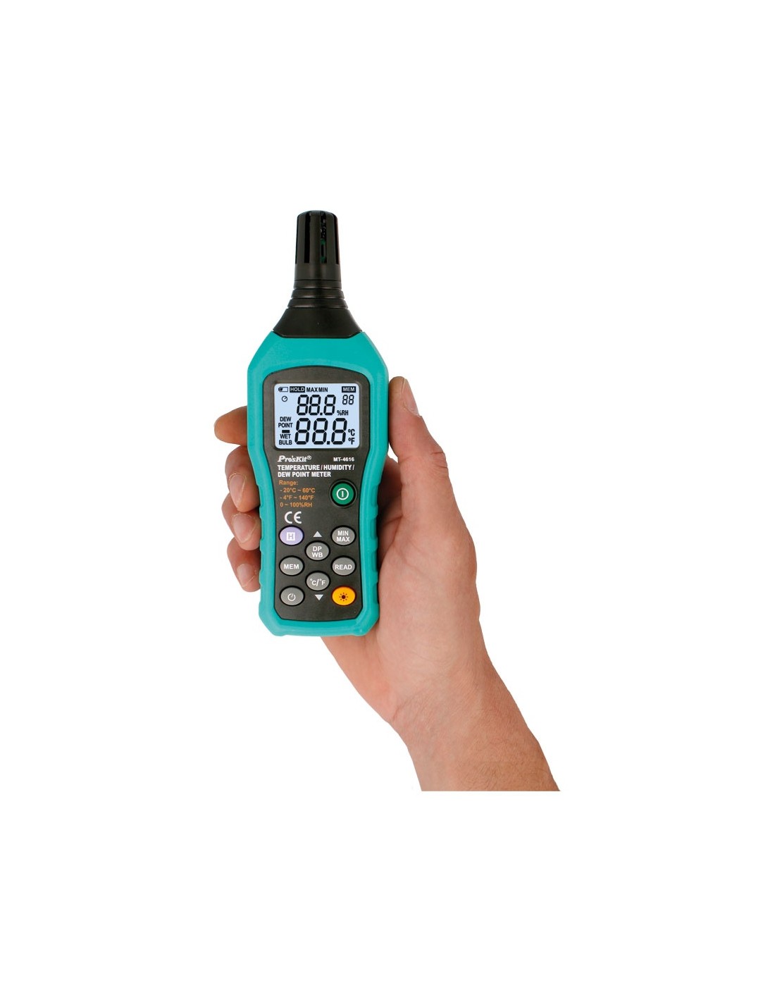 Medidor digtital compacto de temperatura, humedad relativa y punto de rocío. Este medido esta especialmente indicado para realizar mediciones de humedad relativa y temperatura en oficinas, almacenes, edificios, invernaderos, etc.