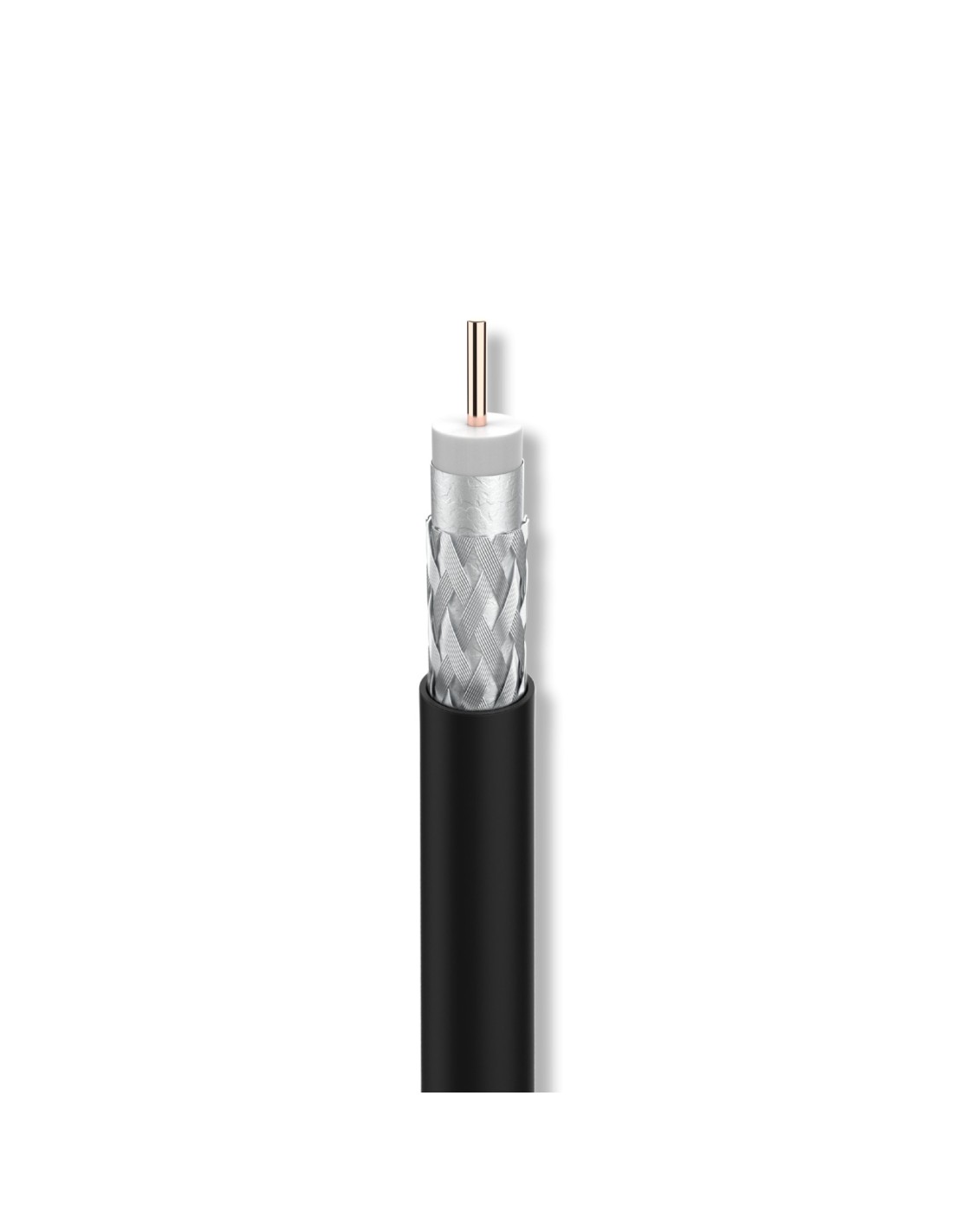 Cable coaxial CXT-1, 17VAtC.A Euroclase Eca. Cable coaxial RG-6 con vivo fabricado en acero cobreado y malla en aluminio (CCS/Al), con una excelente cobertura del trenzado (77%). Un cable 17VAtC.A, de doble blindaje y cubierta PVC. Color: Negro, Tipo de bobina: Madera, Longitud: 250 m.. Conductor interno fabricado en acero cobreado y malla en aluminio. Euroclase Eca.