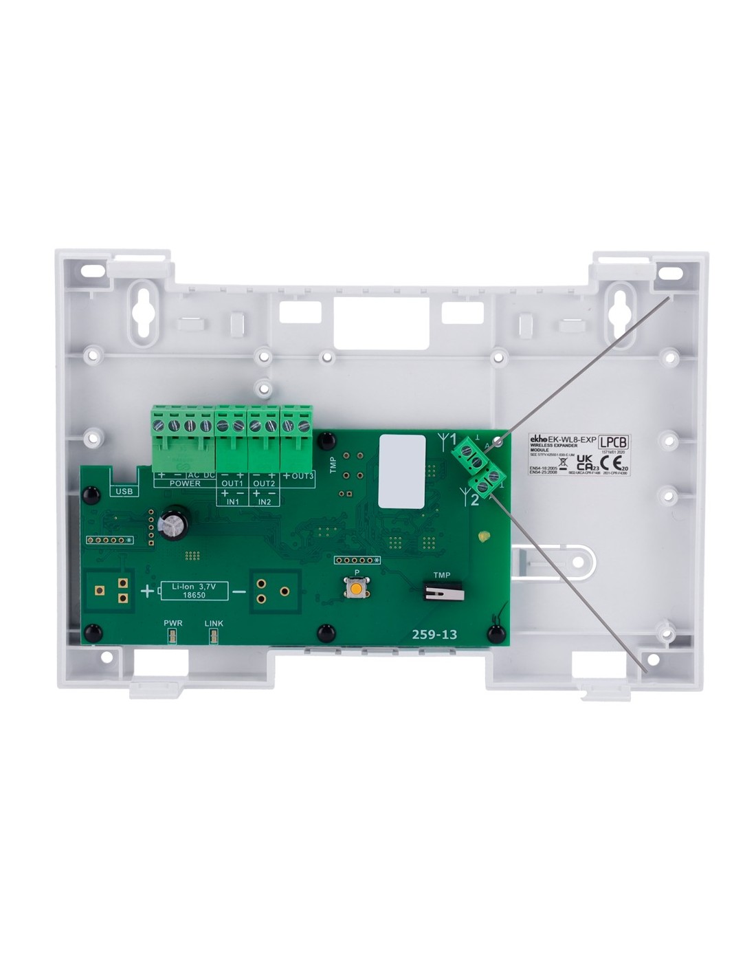 El módulo expansor EK-WL8-EXP aumenta la cobertura de radio de un módulo transceptor EK-WL8-TRH Ekho, lo que permite el uso del sistema en edificios más grandes y en entornos difíciles.