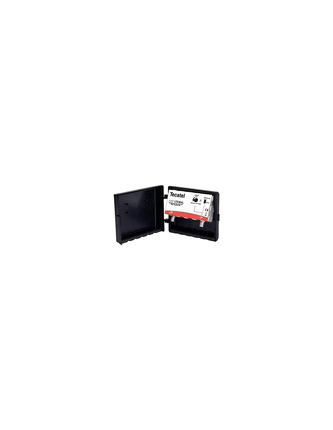 El amplificador está protegido con una carcasa negra de 145 x 110 x 45 mm para poder instalarse a la intemperie, en el mástil de la antena TDT.