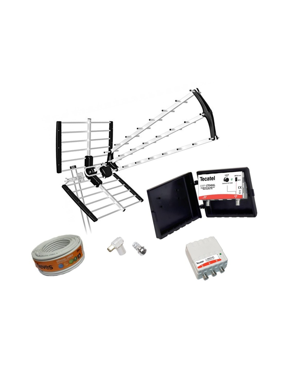 Kit formado por: -;- 1 Ud.de Antena de TV Tecatel ANT-BKM18B700 -;- 1 Ud.de Amplificador de mástil AM-PLTE 404L -;- 1 Ud.de rollo de cable de antena de 20 Mt Televes -;- 1 Ud.de fuente de alimentacion Tecatel fuente de alimentacion Tecatel FA-MAX24160C -;- 1 Ud.de Conector de antena de TV CON-122 -;-