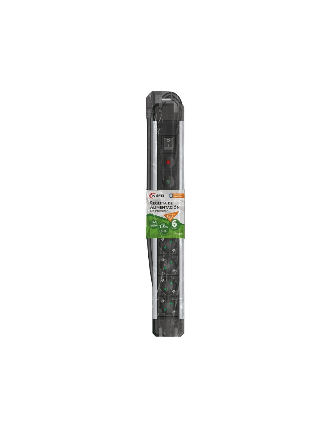 Regleta de 1E:6S Schuko con interruptor y protección MEL058