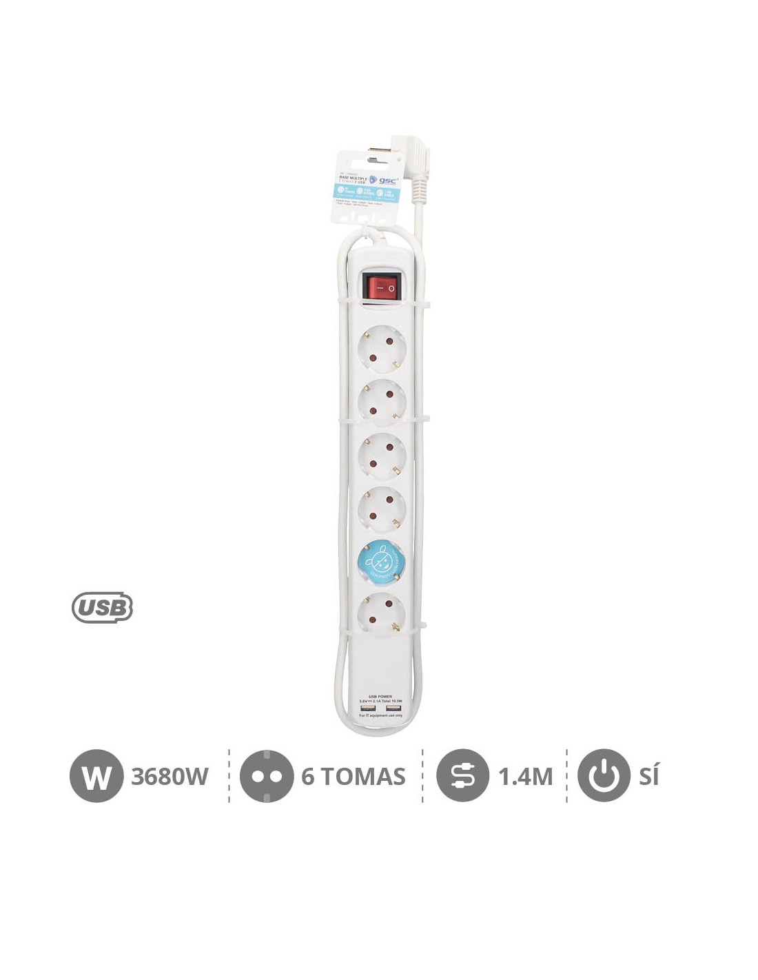 Base múltiple 6T + 2 USB + Int. (3x1.5mm) 1,4M Blanca