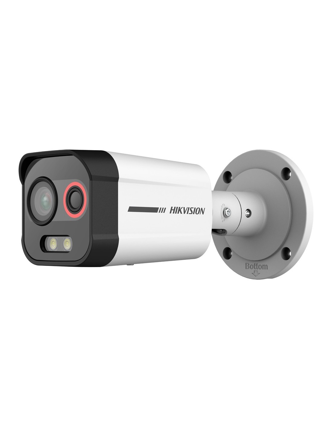 Cámara térmica Dual IP Hikvision Gama PRO - Sensor térmico 96x72 VOx | Lente 1.35 mm - Sensor óptico 1/1.8 4 Mpx | Lente 4 mm - Sensibilidad térmica = 55mK | ColorVu - Detección de preventiva de incendios y alarma - Alarmas | IP66 | IK10 | Audio y luz disuasorios