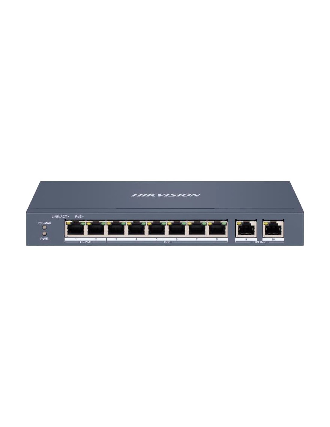 Hikvision HiPoE Switch Gestionable - 8 puertos PoE 802.3af/at + 2 Uplink RJ45 - 8 RJ45 10/100 Mbps + 2 RJ45 10/100/1000 Mbps - 802.3af/at/bt / Máximo 110W - VLAN/Port Isolation/Loop Detection/LLDP - Link Aggregation/PoE Watchdog/SNMP