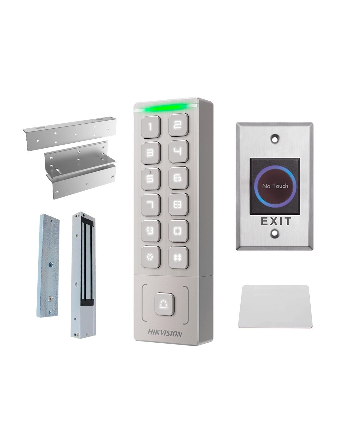 - Kit formado por: DS-K1T809EX control de acceso autónomo con tarjeta MF y PIN, DS-K4H255S ventosa magnética de 272 kg de fuerza de retención, DS-K4H255-LZ perfil en Z para instalación de ventosa magnética, DS-K7P07 pulsador de salida sin contacto y tarjeta MF 13.56 MHz