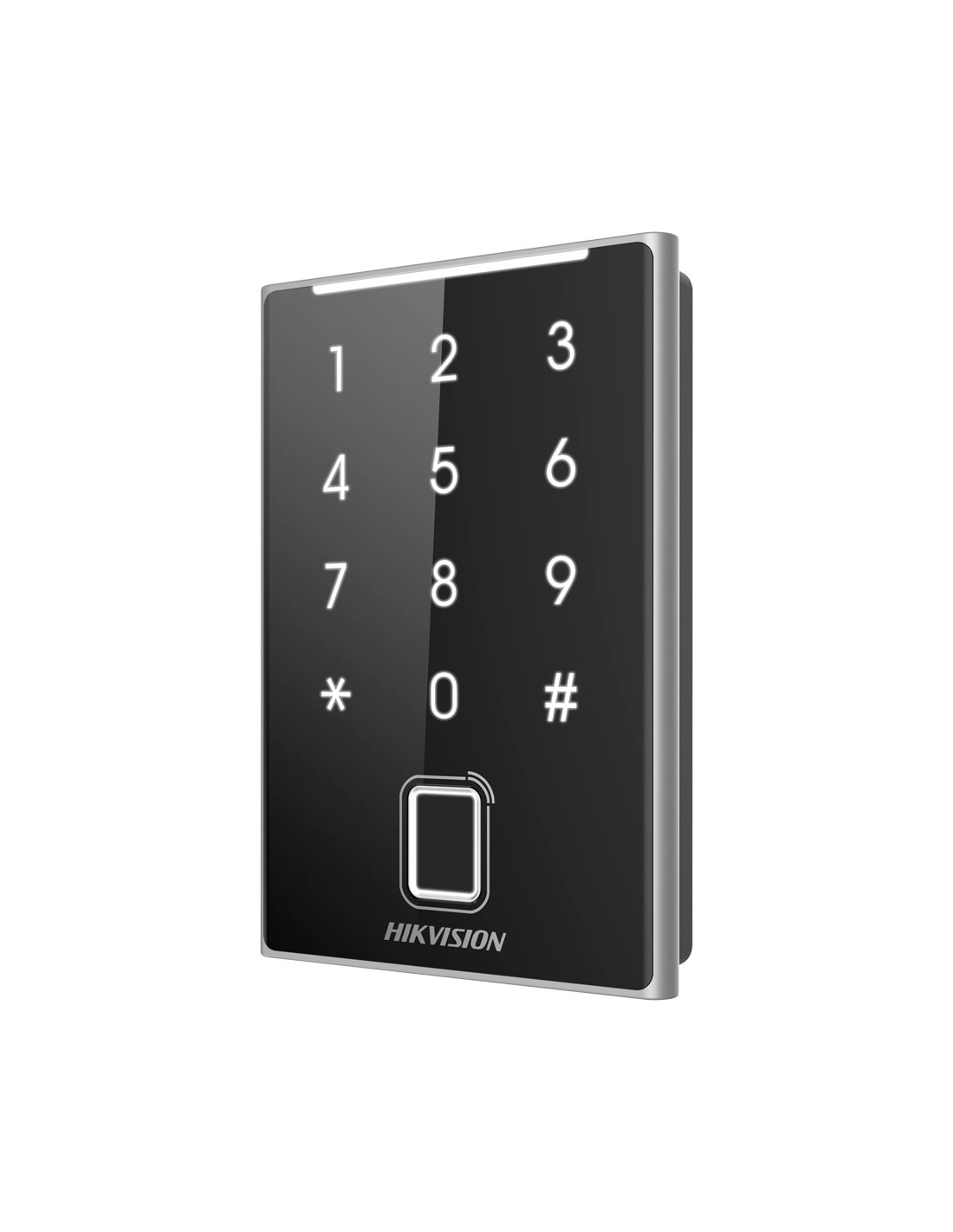 Lector de acceso - Acceso por huella, tarjeta MF DESFire y PIN - Indicador LED y acústico - Wiegand 26/34 | RS485 - Compatible con controladoras Hikvision - Apto para exterior IP65