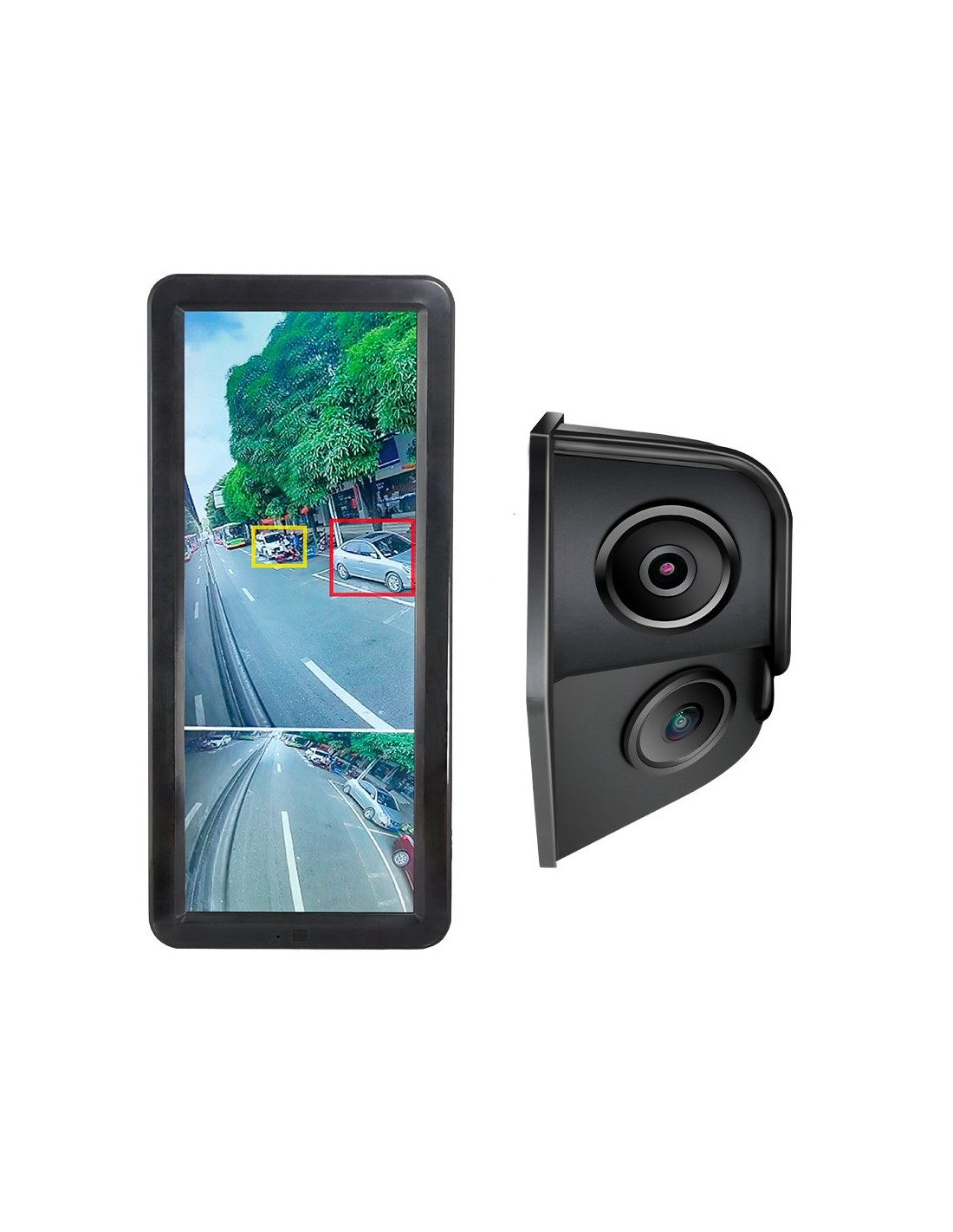 Kit completo de retro visión y ángulo muerto derecho, se compone de monitor y cámara dual con resolución 2MPx. Pantalla IPS con BLC y brillo automático para cualquier condición lumínica. Protección de cámara IP69K con WDR. Rango de voltaje de 10 a 32V.