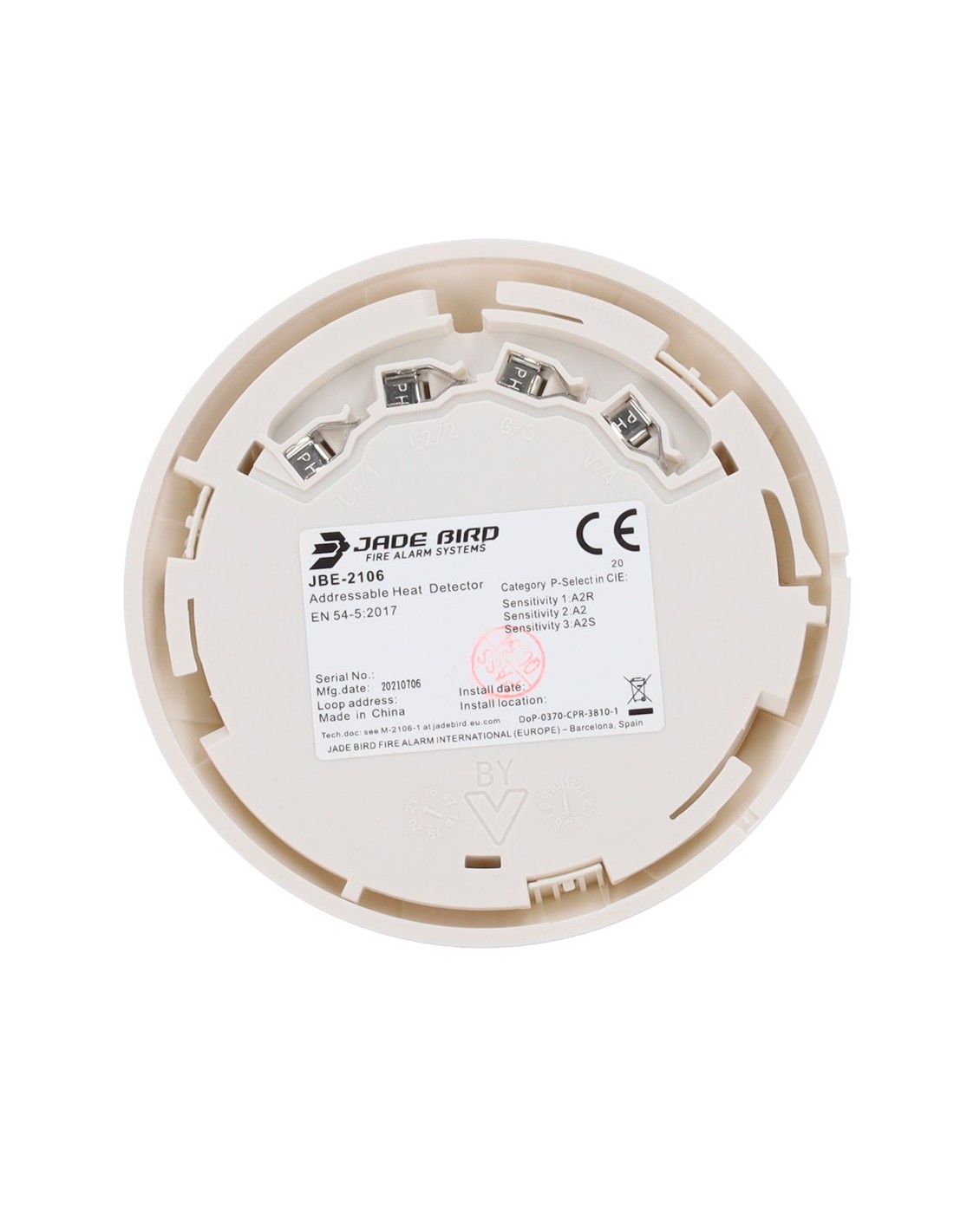 Detector térmico convencional Jade Bird - Sensibilidad y clase ajustable (A2R, A2, A2S) - Led con vision 360° - Salida de indicador remoto - No incluye base - Certificado EN 54-5