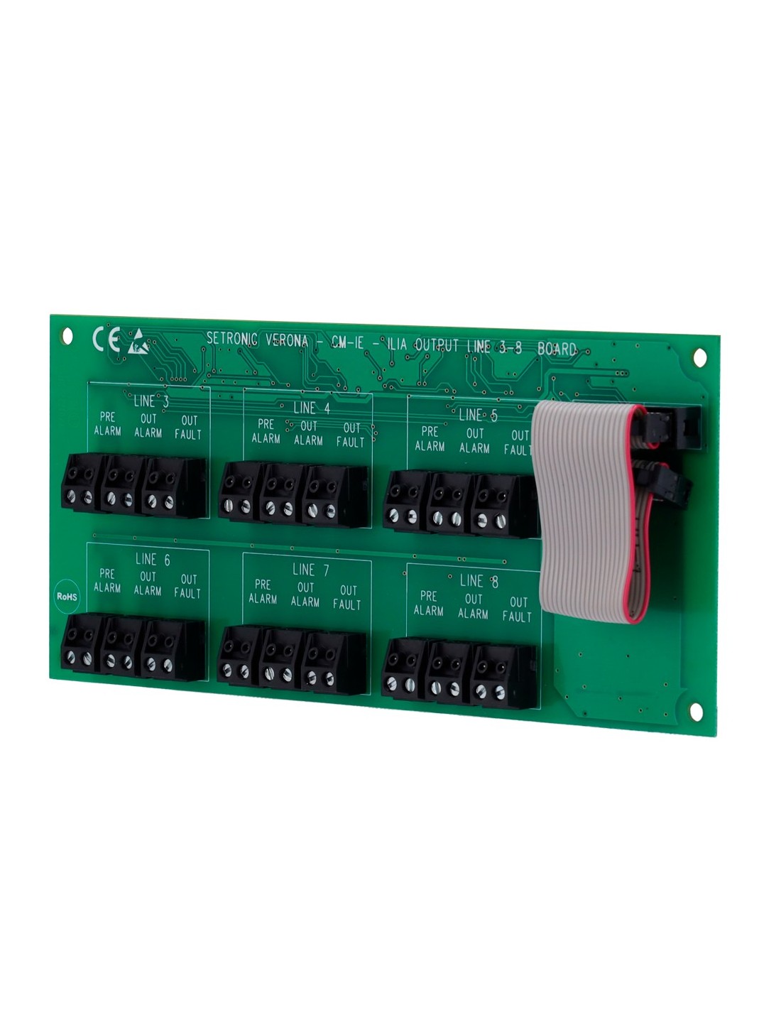 La tarjeta de relé CM-IE para controladoras CLI, proporciona información detallada para los detectores 3 a 8 de un sistema de detección de incendios. Es un módulo diseñado específicamente para su montaje en las unidades de control CLI, facilitando la supervisión avanzada de estados como prealarma, alarma y fallo para múltiples detectores en instalaciones complejas.