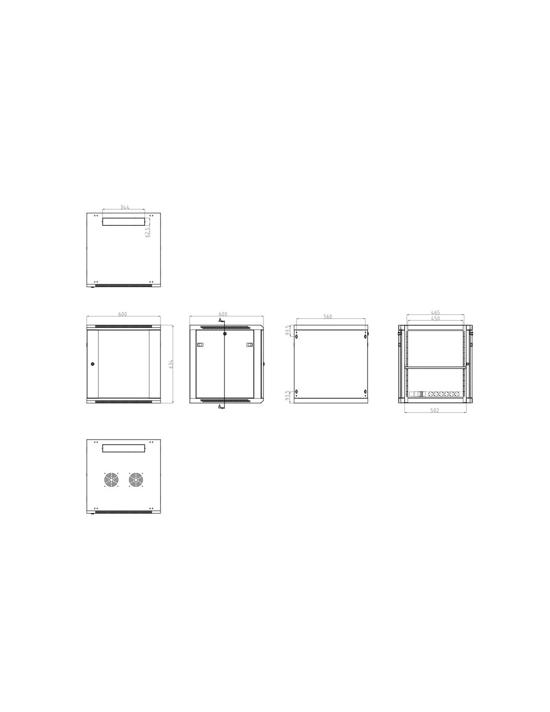 Armario rack para pared - Hasta 12U rack de 19"(600*600) - Hasta 60 Kg de carga - Con ventilación y pasacables - 2 ventilador, bandeja, regleta 6 tomas incluidos - Se suministra desmontado