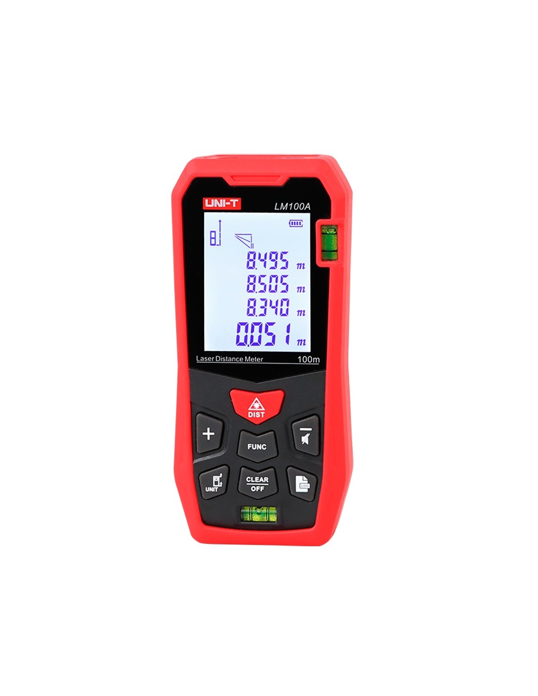 Medidor láser de distancia - Rango de hasta 100 m con precisión milimétrica - Medición de longitud, área, volumen - Diseño ergonómico y confortable - Almacenamiento de hasta 99 conjuntos de datos - Contiene nivelador de burbuja