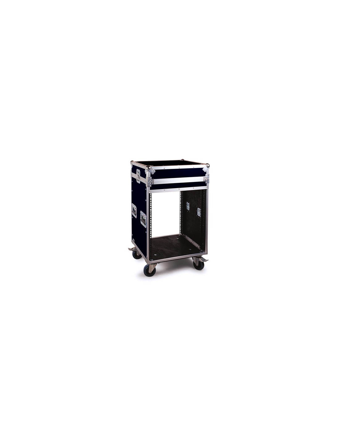 Mueble rack flight case 19" 12 U. Departamento superior. Tapa superior con cierre hermético. Frente/Fondo libre. Asas de transporte. Ruedas con freno. Fondo útil 46'5 cm.