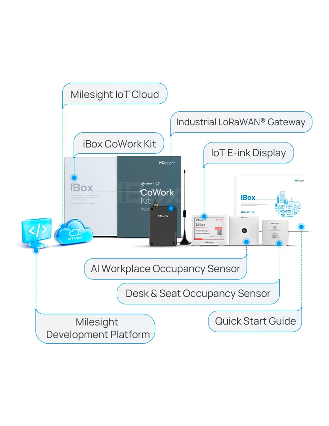 - Compuesto por: gateway (UG56), sensor de ocupación de zona (VS121), sensor de ocupación de puesto (VS340), Display E-ink (DS3604) y un año de Milesight IoT Cloud Pro