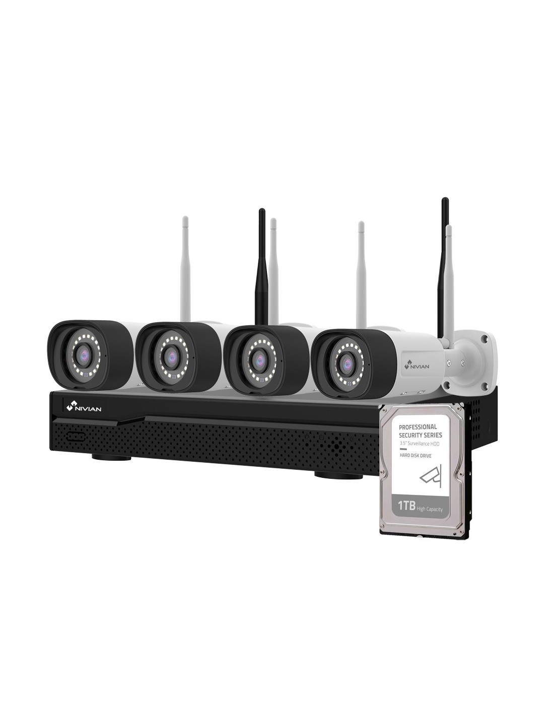 Kit CCTV WiFi Nivian - NVR 10 canales - 4 cámaras 3 Mpx preregistradas - Aptas para exterior IP66 - Incluye 1 Disco Duro 1TB - App y Software Eseecloud