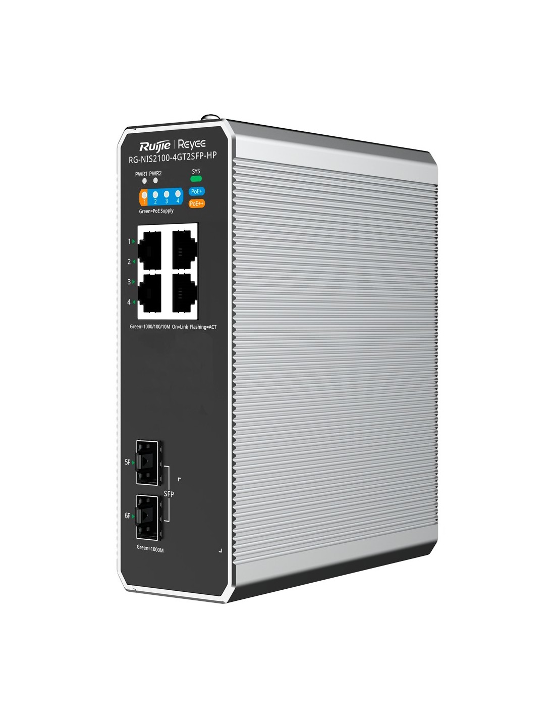 Reyee Switch Industrial PoE Cloud Capa 2 - 4 puertos RJ45 Gigabit + 2 puertos SFP Gigabit - 4 Puertos PoE+ 30W + 1 Puertos Hi-PoE 90W - PoE extendido (puertos 3~4) / Port Isolation - VLAN/ERPS/Loop Prevention/Watchdog/DHCP Snooping - Montaje en carril DIN