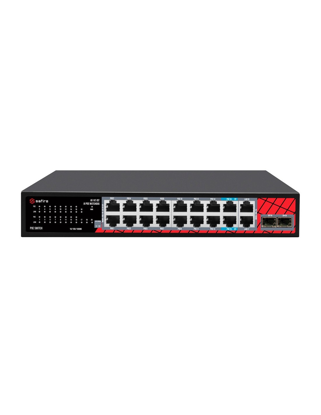 SAFIRE SWITCH HI-POE - 16 PUERTOS POE + 2 SFP + 2 RJ45 - VELOCIDAD DE PUERTOS 10/100/1000/2500 MBPS - 14 PUERTOS POE+ 30W + 2 PU