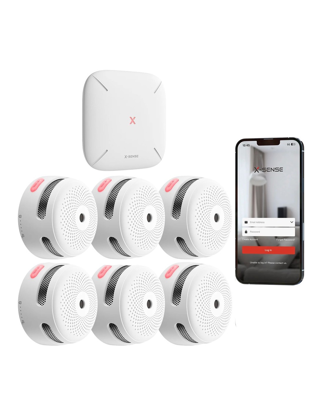 KIT DE DETECCIÓN DE INCENDIO AUTÓNOMO X-SENSE - INLCUYE 6 DETECTORES DE HUMO XS01-M Y HUB SBS50 - CONEXIÓN CON HUB SBS50 PARA CO