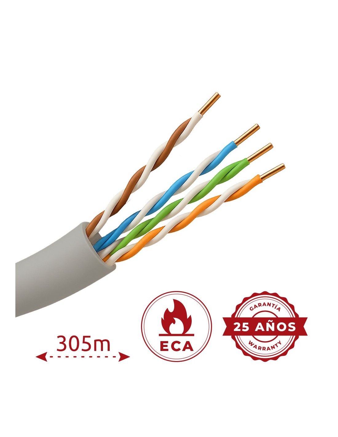 CAABLE UTP CATEGORÍA 5E - CONDUCTOR OFC,100% COBRE - DIÁMETRO 25 AWG-0,45MM - CERTIFICADO CPR ECA - CUBIERTA EXTERIOR PVC COLOR