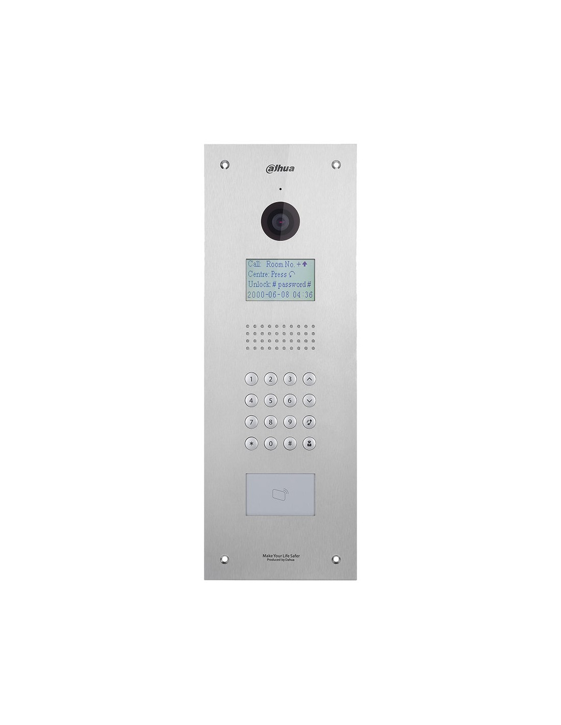 Estación de videoportero SIP Dahua apta para exterior. H.264. CMOS de 1,3MP. óptica de 4 mm (95°). G.711. Audio bidireccional. 2 entradas de alarma. RS485. IP54, IK07. 12V CC
