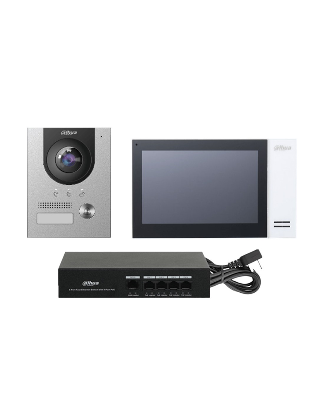 Kit de videoportero IP Dahua compuesto por:. 1x videoportero IP DHI-VTO2201F-P. 1x monitor IP DAHUA-2031 (VTH2421FW-P). 1x switch DH-PFS3005-4ET-36E.