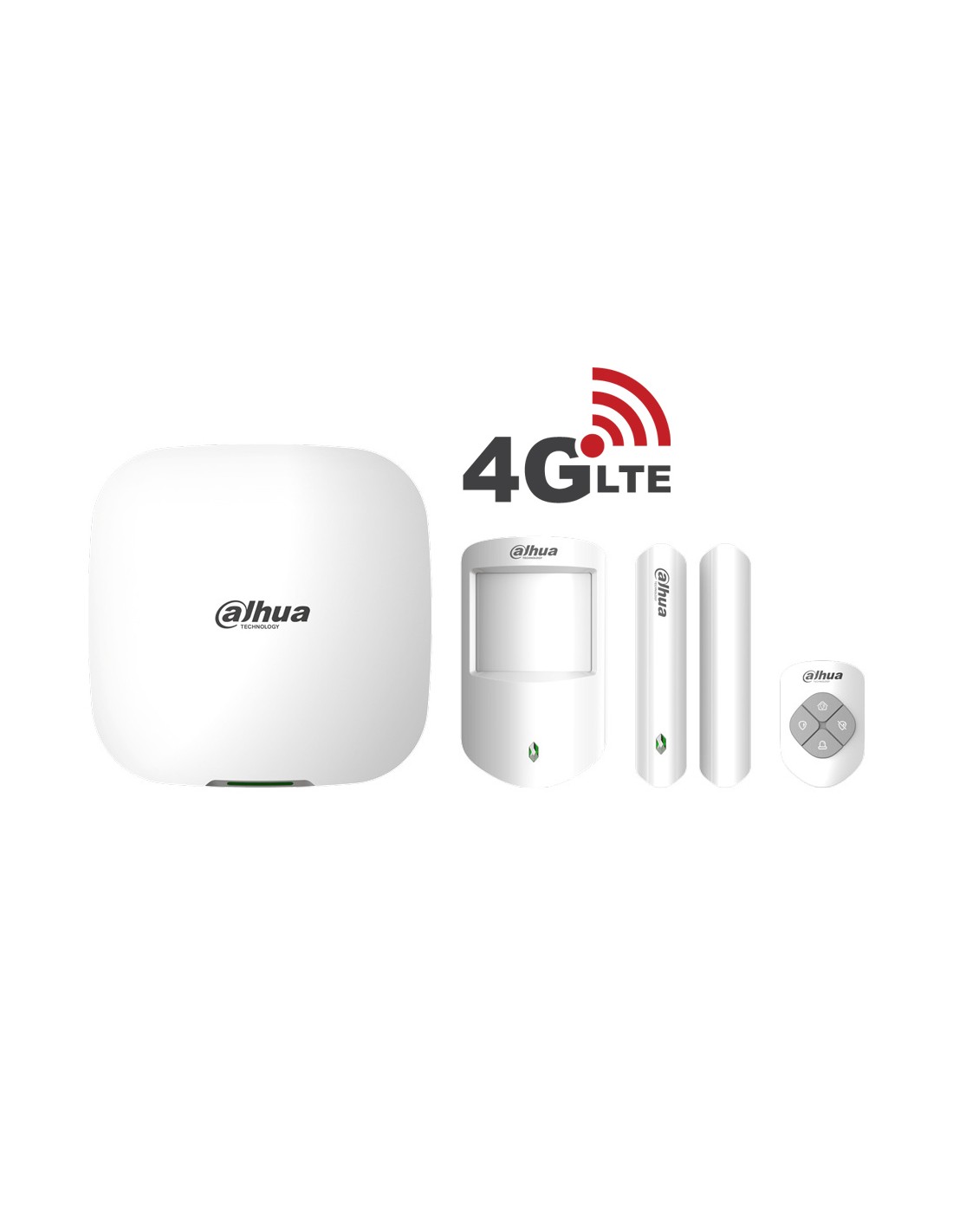 Kit de alarma Dahua 4G LTE compuesto por:. 1x Panel de control 4G LTE de 150 dispositivos vía radio, certificado de Grado 2. 1x Pulsador vía radio 868MHz. 1x Detector PIR vía radio 868MHz con Alcance de 12 metros y antimascotas hasta 18 kg. 1x Magnético vía radio 868MHz.