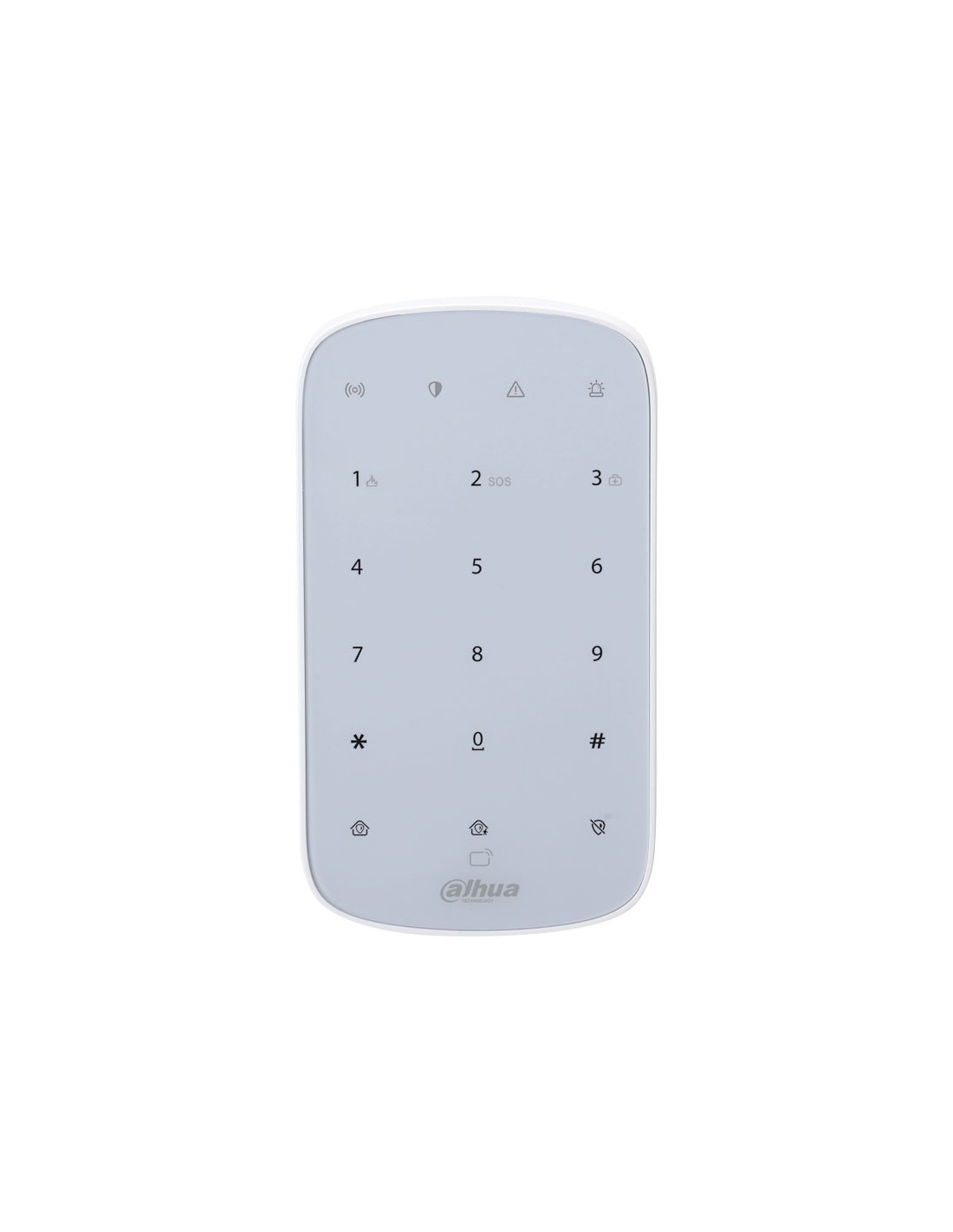Teclado vía radio Dahua. Permite la conexión de hasta 32 periféricos. Accesos directos: Alarma Médica, Incendio y Emergencia. Armado/desarmado con contraseña o tarjeta IC. Detección de la intensidad de la señal. Alarma de batería baja. Medición de temperatura. Salto de frecuencia y comunicación bidireccional. Actualización en la nube y recuperación automática en caso de fallo de actualización