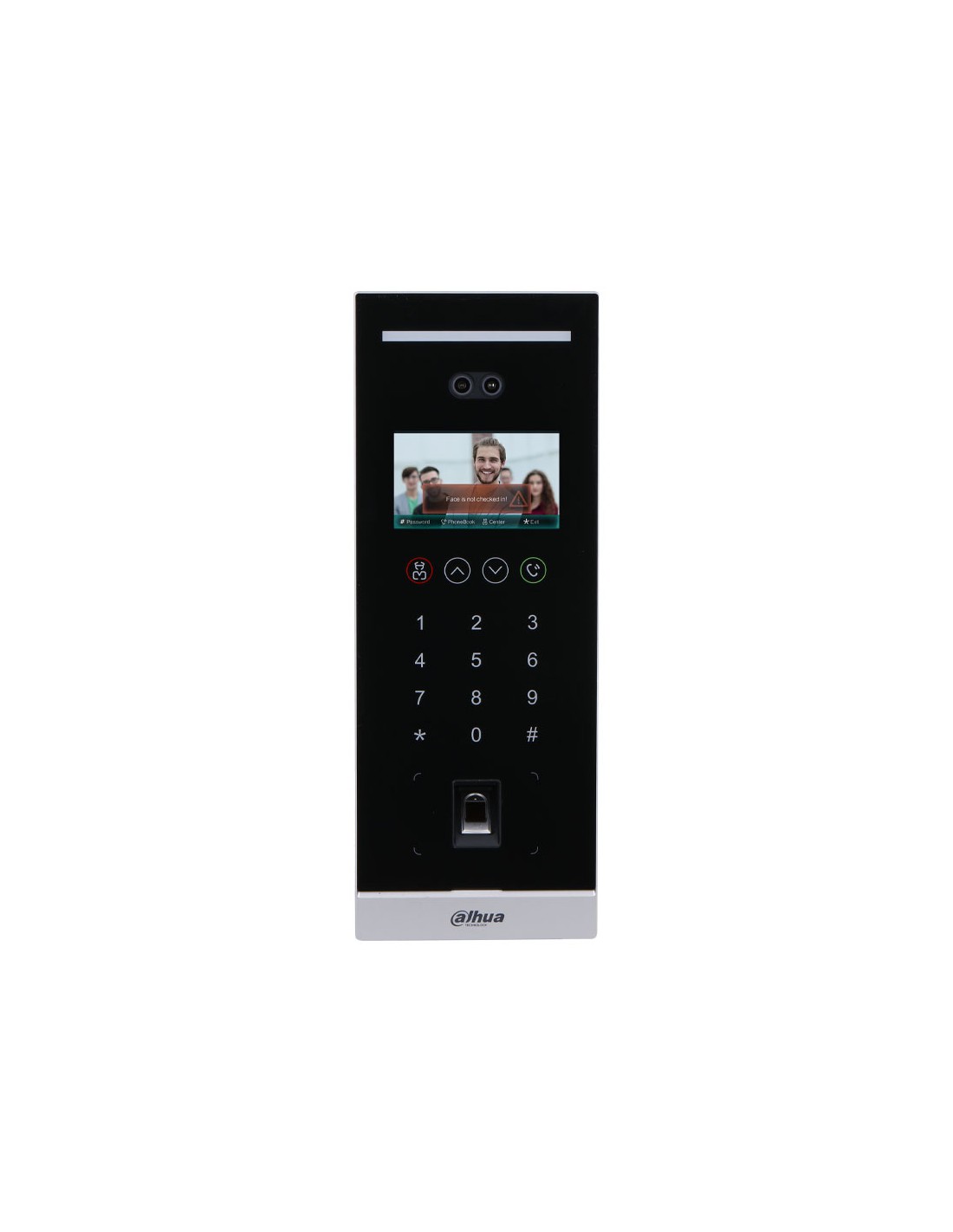 Videoportero Dahua. Pantalla IPS de 4,3" (800x480). Cámara de 2MP con leds IR + luz blanca y WDR. Reconocimiento facial de 0,3 a 2 metros y 0,2 seg. por persona. 20 000 usuarios, 10 000 rostros, 10 000 tarjetas y 10 000 huellas. Múltiples modos de desbloqueo. Detección de vivacidad para prevención de suplantación de identidad. Alarma de coacción, de manipulación y de tiempo de espera de puerta. IP65 apto para exterior
