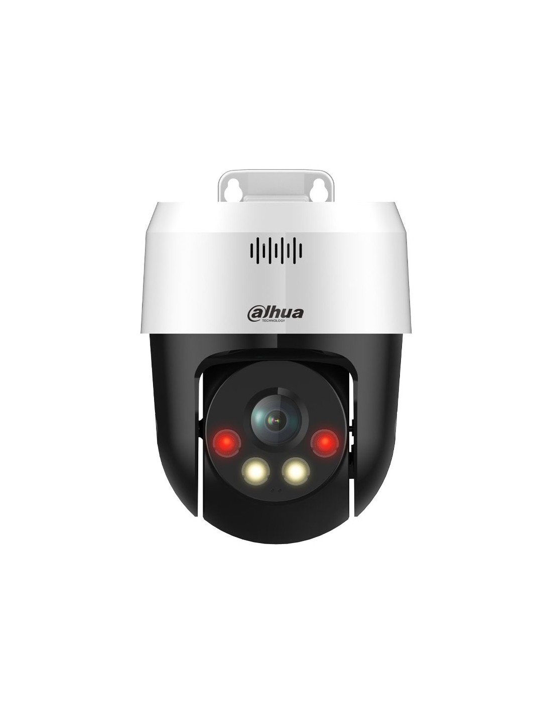 - Incorpora disuasión activa mediante flash de luz blanca y sirena para alarma por voz