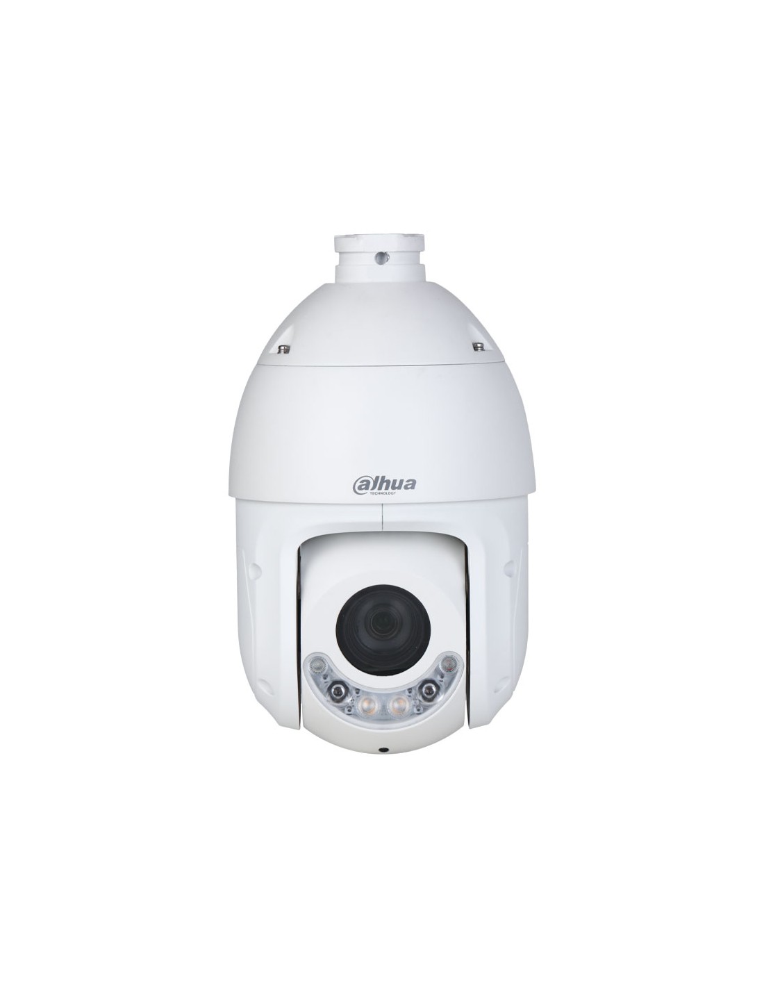 Domo PTZ IP Dahua WizSense con disuasión activa. 4MP@25/30ips, Smart H.265+. 0,005/0,0005 lux, IR 100m, luz blanca 50 m. Zoom óptico 25X (5~125 mm). WDR 120dB, ROI. Disuasión activa (luz+sonido). Pan&Tilt: 360°@200°/s (H); 90°@120°/s (V); 300 presets. Protección perimetral, detección facial, SMD y autotracking. 1 entrada / 1 salida de audio. 2 entradas / 1 salida de alarma. Ranura MicroSD, RJ45, Onvif, IP66, PoE+