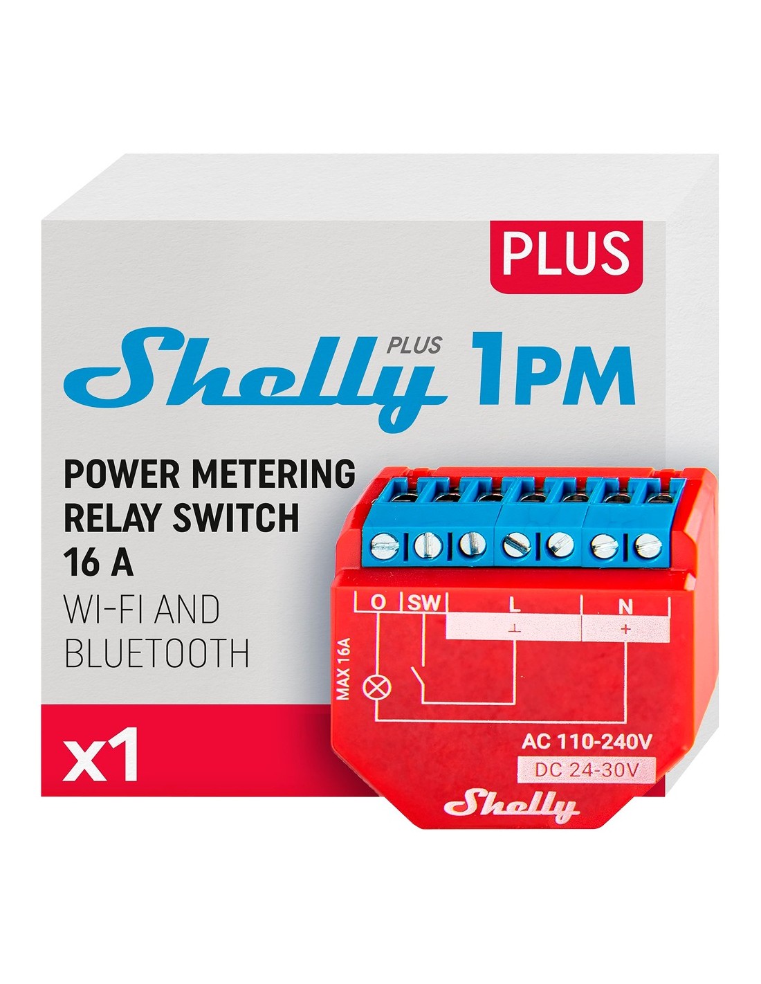 Shelly Plus 1PM - WiFi 2.4 GHz IEEE802.11 b/g/n / Bluetooth - Interruptor inteligente - Soporta 110-240 V / 24V - Medidor de consumo - Compatible con Alexa y Google