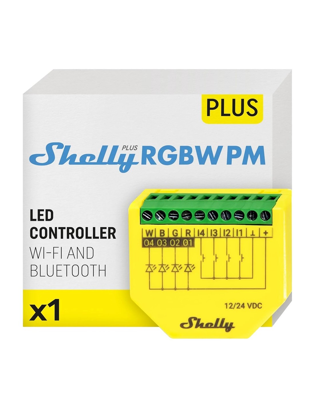 Shelly Controlador RGBW para tiras LED - WiFi 2.4 GHz IEEE802.11 b/g/n / Bluetooth - Admite cualquier tira de LED RGB/RGBW - Soporta 12V / 24V - Medición de potencia - Compatible con Alexa y Google