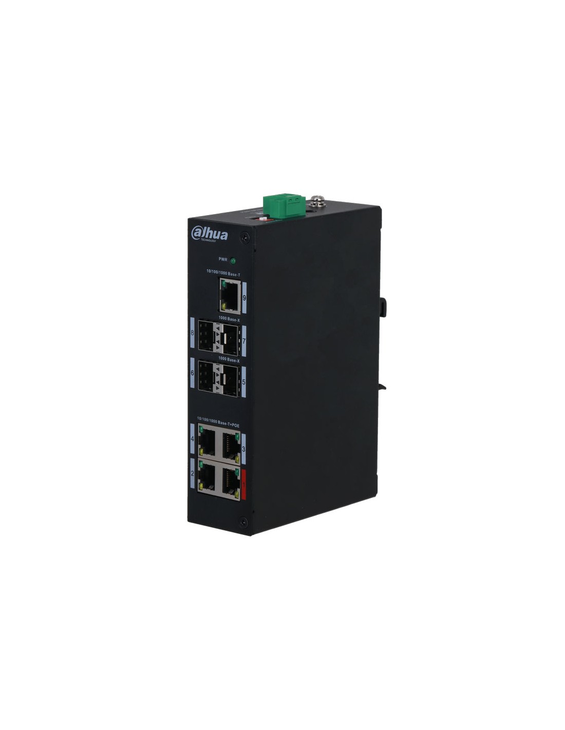 Switch Dahua no gestionable de gama industrial. 4 RJ45 Gigabit PoE/PoE+/Hi-PoE/PoEbt. 4 SFP uplink Gigabit. 1 RJ45 Uplink Gigabit. Transmisión PoE hasta 250 metros. Temperatura de funcionamiento extendida. 48V CC.