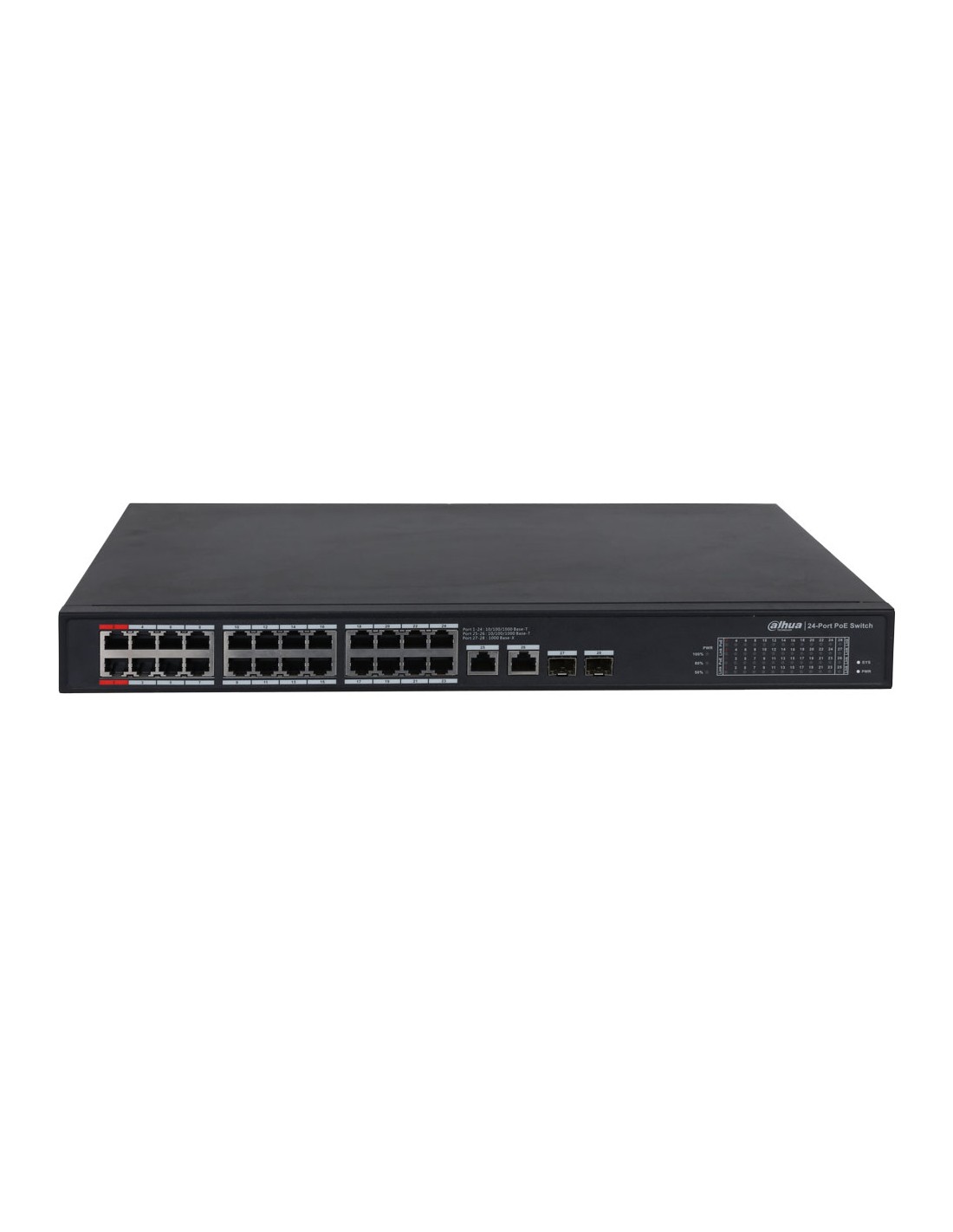 Switch PoE no gestionable L2 Dahua. 24 puertos PoE Gigabit. 2 puertos RJ45 Uplink Gigabit. 2 puertos SFP Gigabit. Consumo PoE de 360W. Plug&Play. 220V CA