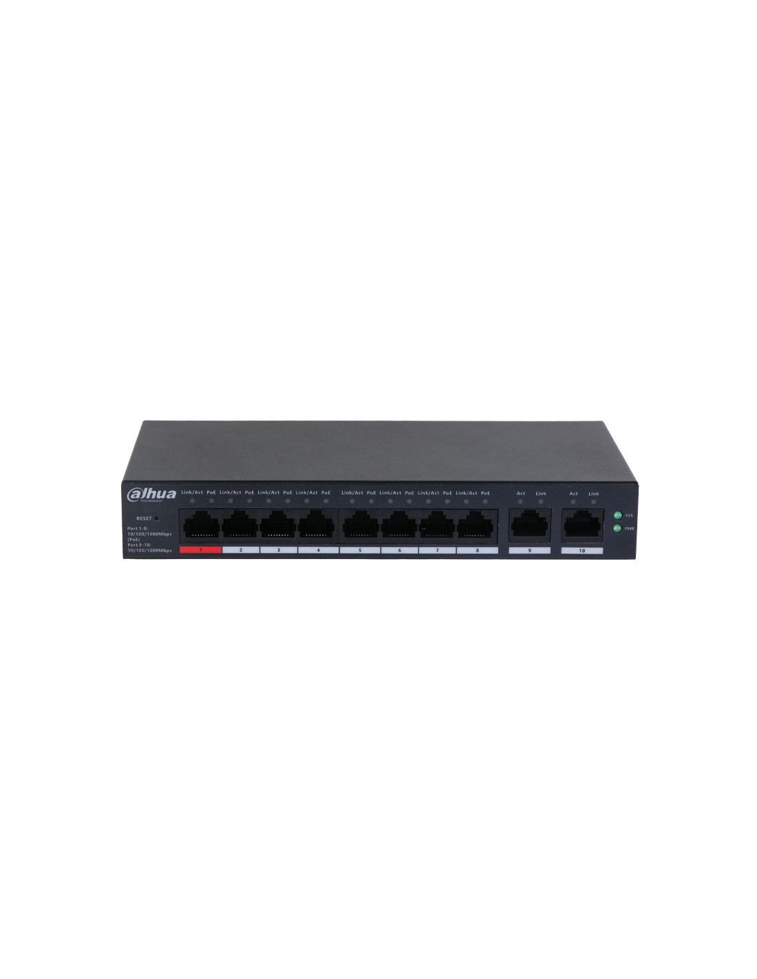 Switch Dahua gestionable Layer2 en la nube. 8 puertos PoE Gigabit. 2 puertos RJ45 Uplink Gigabit. Direcciones MAC 8K. Gestión de consumo PoE. Admite PoE inteligente. Entrega PoE total de 110W. Gestión de la nube. Gestión de la topología de red. PoE de larga distancia. Protocolo Spanning Tree (STP). Watchdog PoE. Protección del bucle. Incluye alimentador 220V