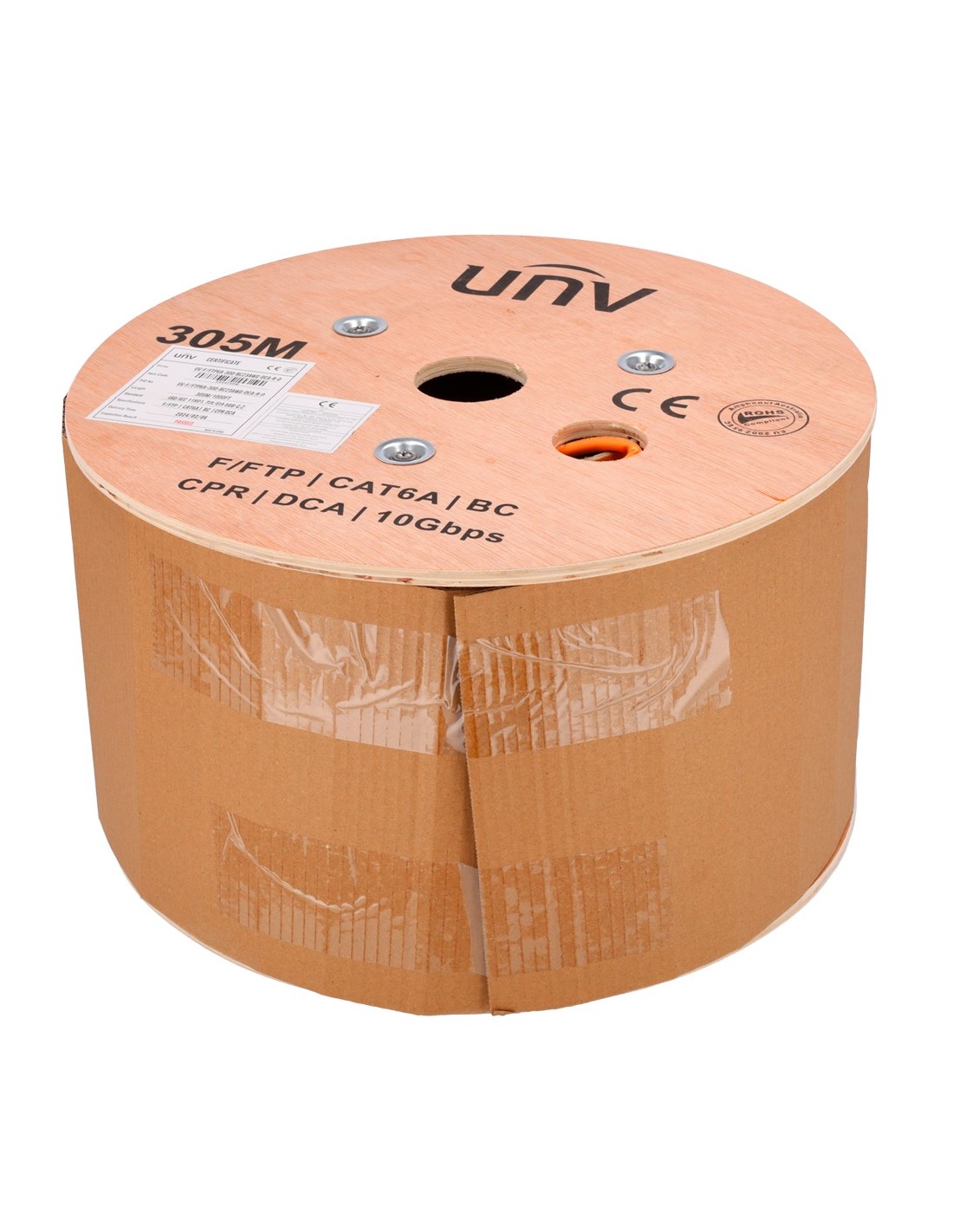Uniview cable F/FTP categoría 6A - Conductor OFC,100% cobre - Diámetro 23 AWG-0,57mm - Certificado CPR Dca - Cubierta exterior LSZH / Color naranja - Se suministra en bobinas de Madera de 305 metros