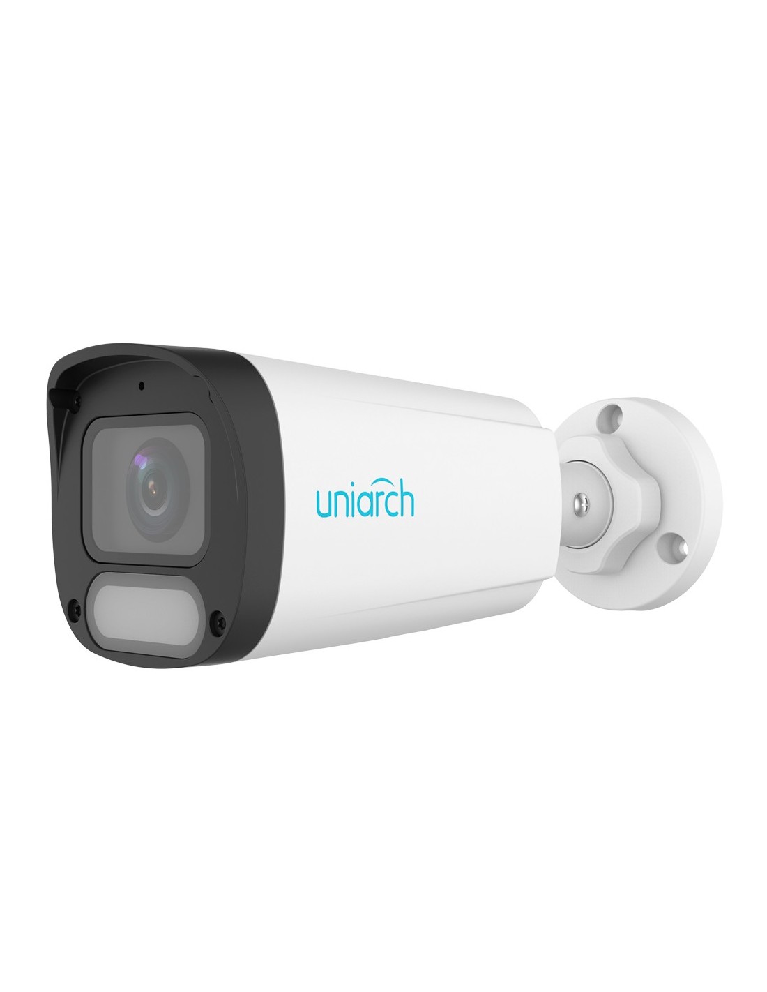 Cámara IP Uniarch tipo Bullet de 2 MP con lente fija de 2.8 mm, cuenta con tecnología Color Hunter con Wise-ISP para imágenes a color en cualquier entorno y UMD. Apta para instalar en exterior, gracias a su protección IP67 e iluminación blanca con alcance de hasta 30 m.